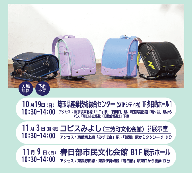アウトレットSALE! 最大70% オフ 出張ランドセル館【コピスみよし(三芳町文化会館)】【株式会社 神田屋鞄製作所】